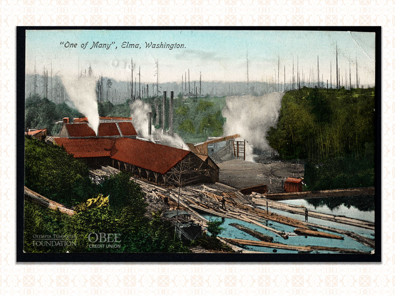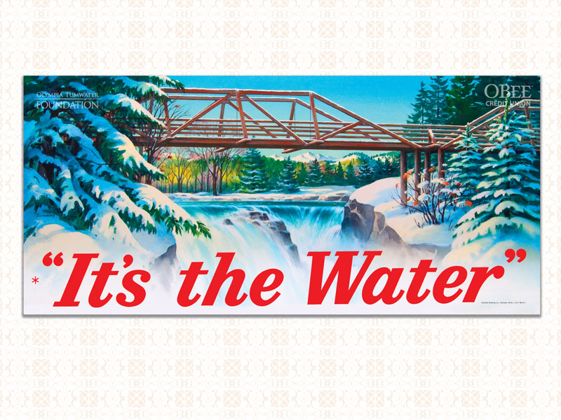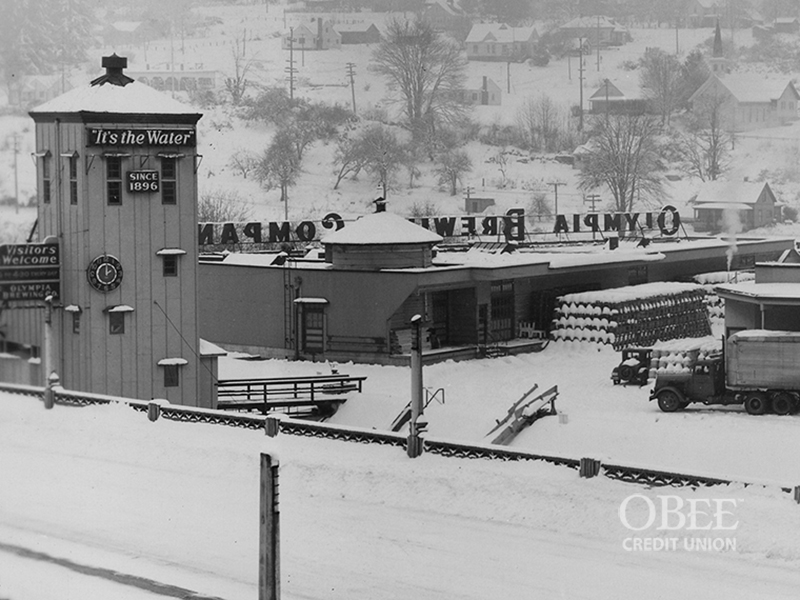 A snowy afternoon in Tumwater, probably in the 1940s. The photographer was standing to the east of the brewery, looking over the Carlyon (totem pole) bridge in the foreground. To the left is the malt tower and its well-known clock. The little Methodist church on 2nd Avenue appears in the top right corner.