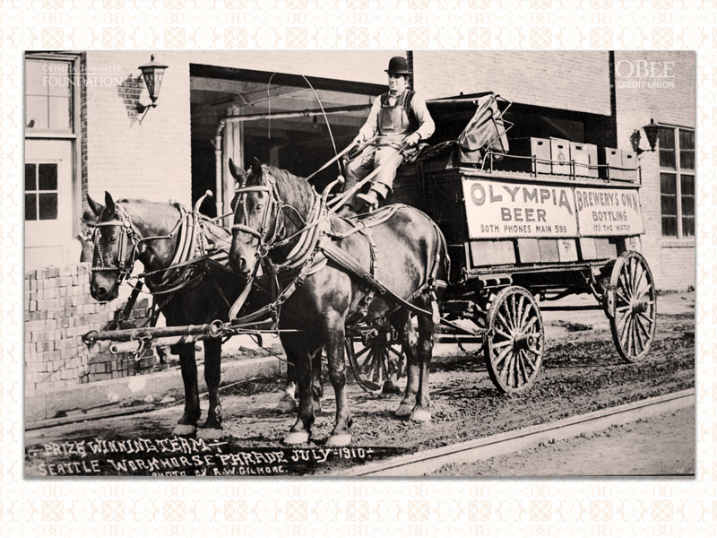 Seattle held a grand Workhorse Parade on July 4, 1910, and the Olympia Beer team won a prize in the parade. In the early 1900s, workhorse parades were a staple in many cities. Even though automobiles and trucks had been around for a few years, horses still did the bulk of the transportation work. The Seattle parade was originally scheduled to be held on Memorial Day, but war veterans protested. They denounced the parade as “an ungrateful interference with the honored observance” of Memorial Day. So the date was changed to the Fourth of July, and many area teamsters participated.